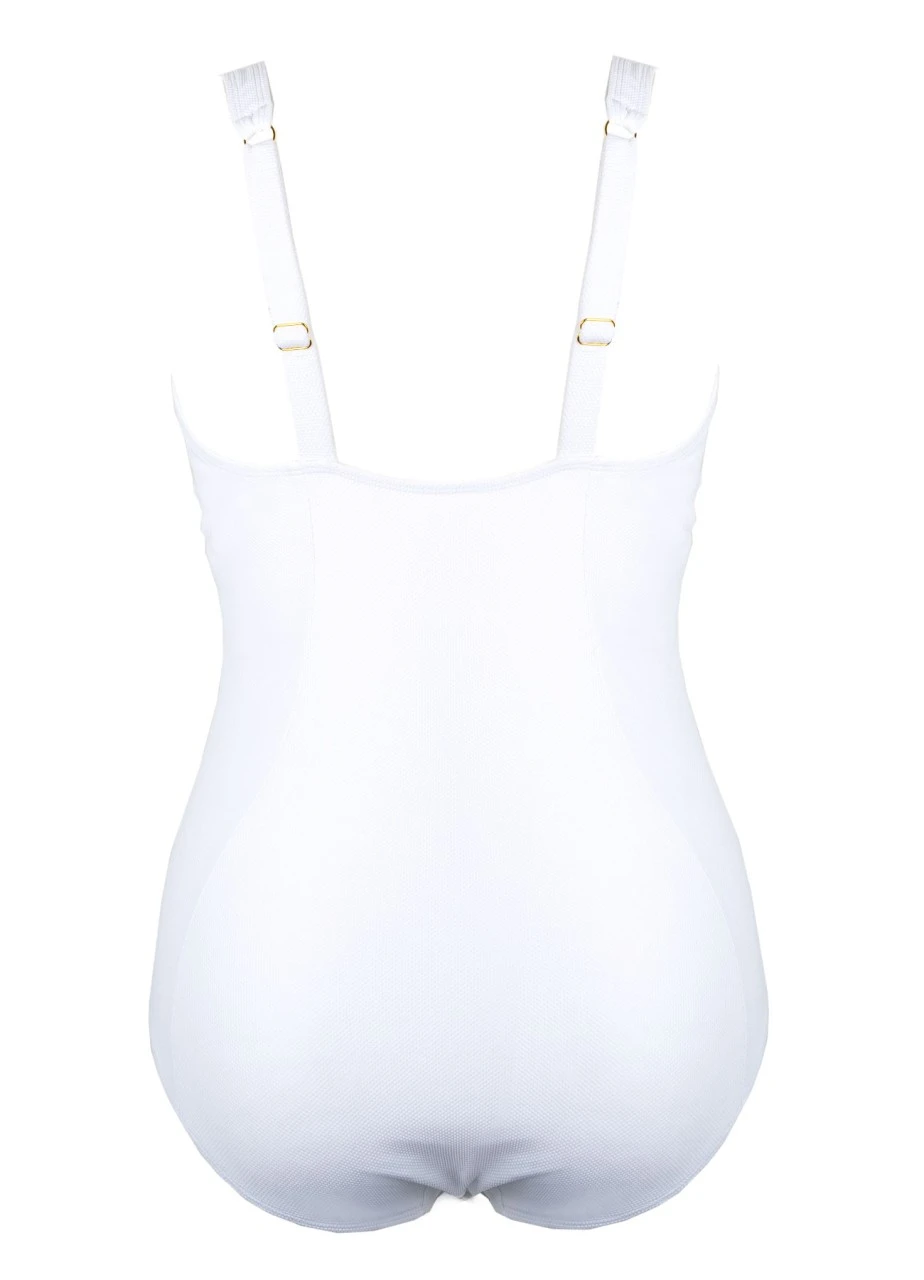 Der Badeanzug „LUXE“ in klassischem Weiß ist schlicht und elegant zugleich – der perfekte Strandbegleiter! Vorgeformte Softschalen und eine feste Unterbrustfütterung sorgen für guten Halt. Die seitliche Raffung und der leichte Shaping-Effekt formen sanft.