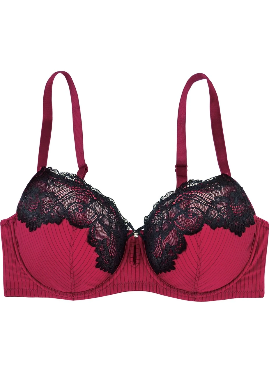 Der Bügel-BH „Celine“ in Rouge mit zarten Streifen in limitierter Stückzahl namens Celine von Marie Meili kombiniert erstklassigen Garn und Microfaser mit edler schwarzer Spitze. Ein klassisch schönes Design, dass Ihre Kurven toll zur Geltung bringt. Die Cups sind am oberen Rand mit zarter Spitze abgeschlossen.