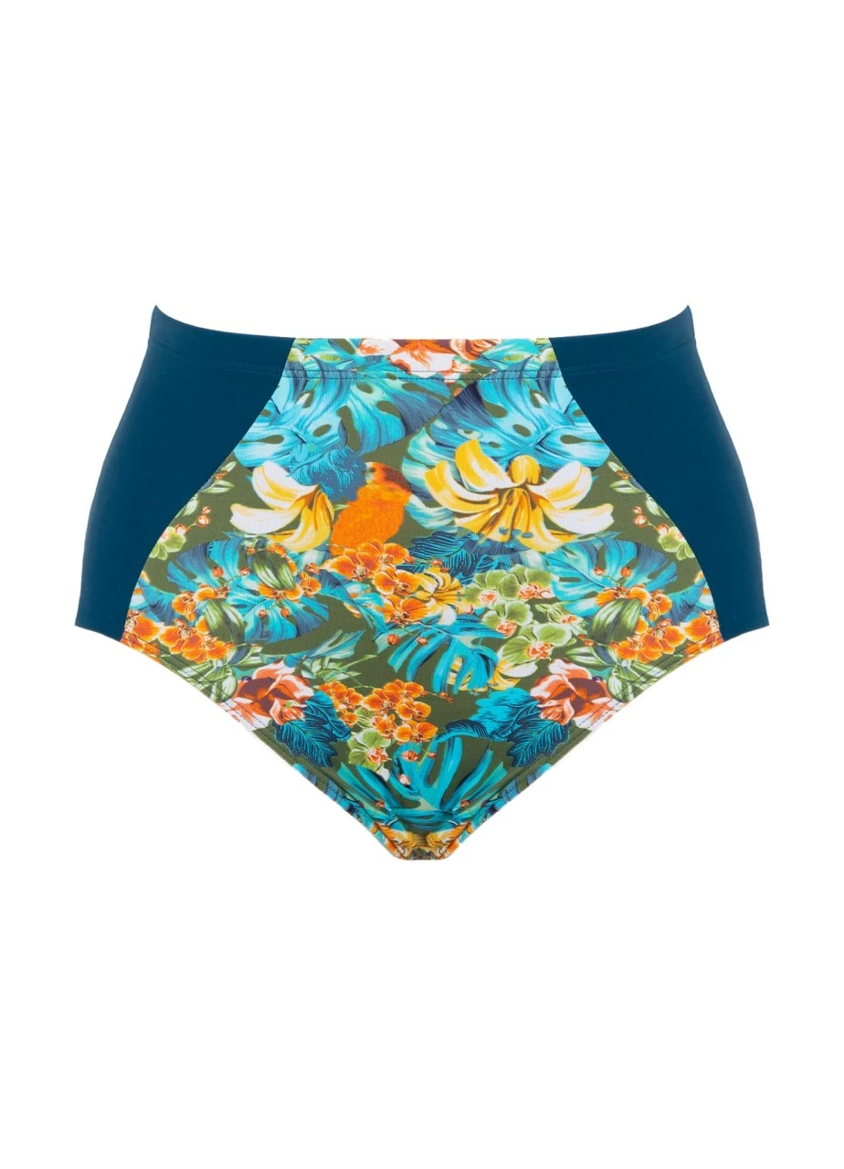 Im Stil der Sixties ist das High Waist Höschen des Bikinis „Lush“ auf Ihre Figur zugeschnitten, denn sein fester, jedoch nicht einschnürender Stoff, schmeichelt Ihrer Figur mitsamt seiner Teilungsnähte. Gemacht für Sanduhren-Figuren, lässt der hohe Bund Ihre Beine länger wirken, integriertes Powermesh sorgt für einen flachen Bauch. Sein dunkles Türkis kombiniert mit dem floralen Dschungelprint sorgen für einen Kontrast der wunderschön ins Trendthema des Sommers passt.