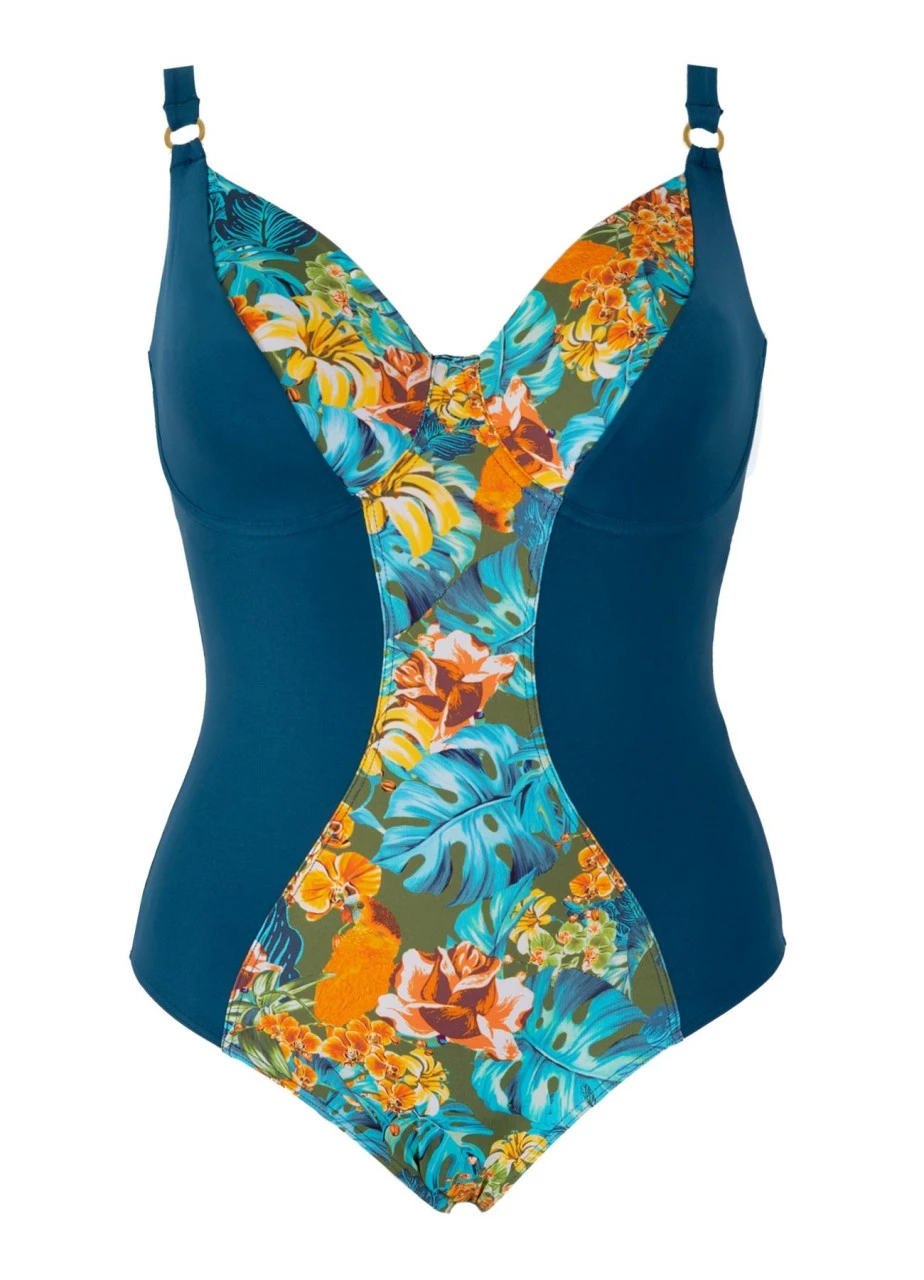 Der Badeanzug „Lush“ besticht durch seinen exotischen Print und Minimizer-Effekt, dass die Oberweite optisch um eine Größe verkleinert. Der türkise Stoff in Kombination kombiniert mit dem floralen Print bringt die Farben zum Leuchten. Verziert ist dieses Bikinitop mit goldenen Zierringen und einem festsitzenden Klickverschluss im Rücken. Die Trägerbreite ist zudem an die jeweilige Größe angepasst und die Träger sind längenverstellbar.