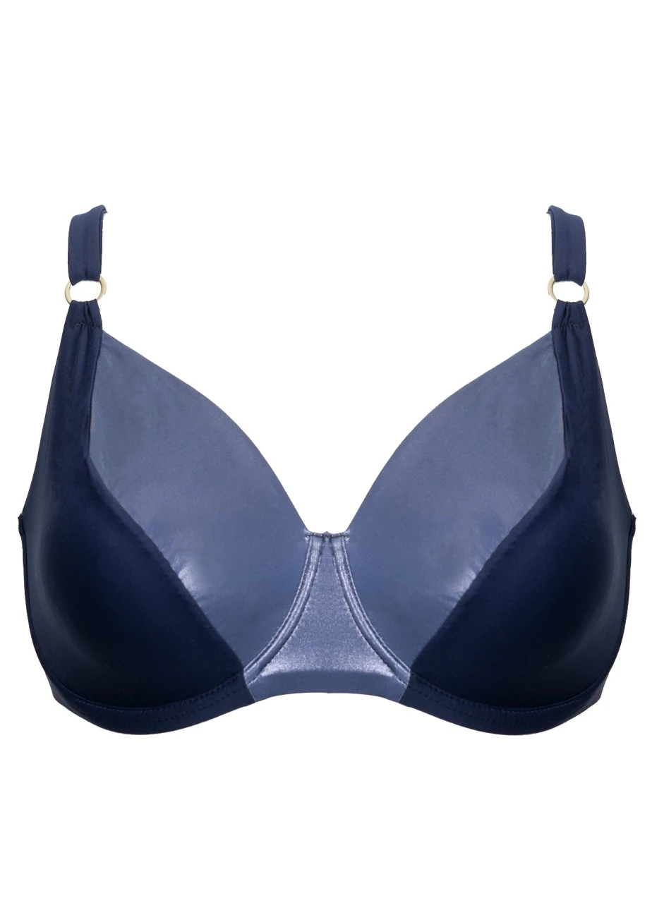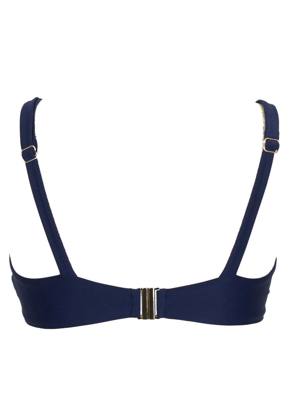 Das zweifärbige Bikinitop in marineblau folgt dem Trend „shiny swimwear“ und erzielt einen Minimizer Effekt durch seine straffe Innenfütterung. Hochwertige italienische Materialien sind verarbeitet, eine stabile Reifenqualität ist garantiert.