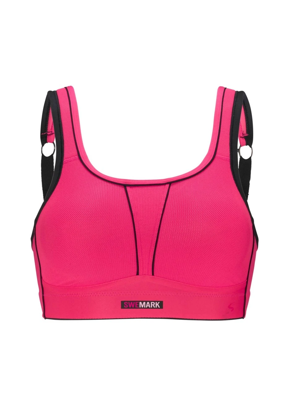 Der leuchtende, pinke Sport-BH „Movement“ ist genau das, was Sie bei einem extrem belastenden Sport wie Joggen brauchen. Seine gepolsterten Träger entlasten die Schultern und die Brust wird auch ohne Bügel perfekt gestützt. Seine luftigen Materialien transportieren Feuchtigkeit nach außen und sorgen für ein trockenes Hautklima. Außerdem lassen sich die Träger am Rücken ineinander haken, sodass ein Racerback entsteht. Marke: Swegmark