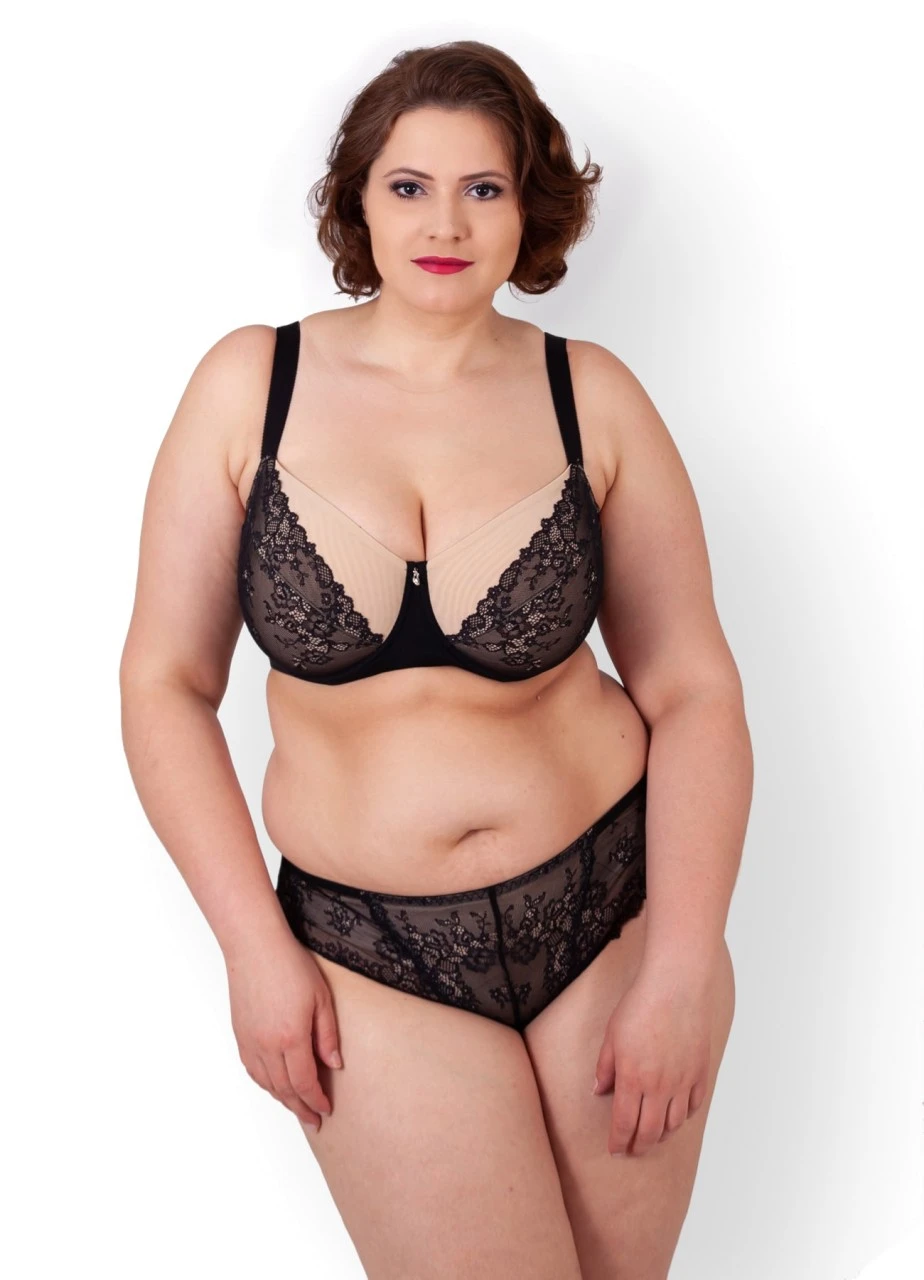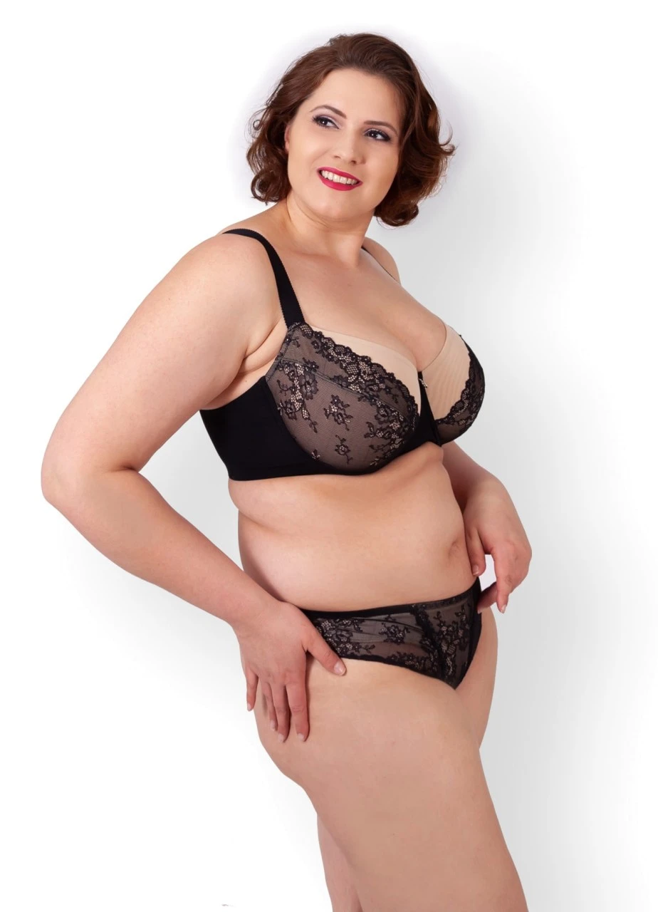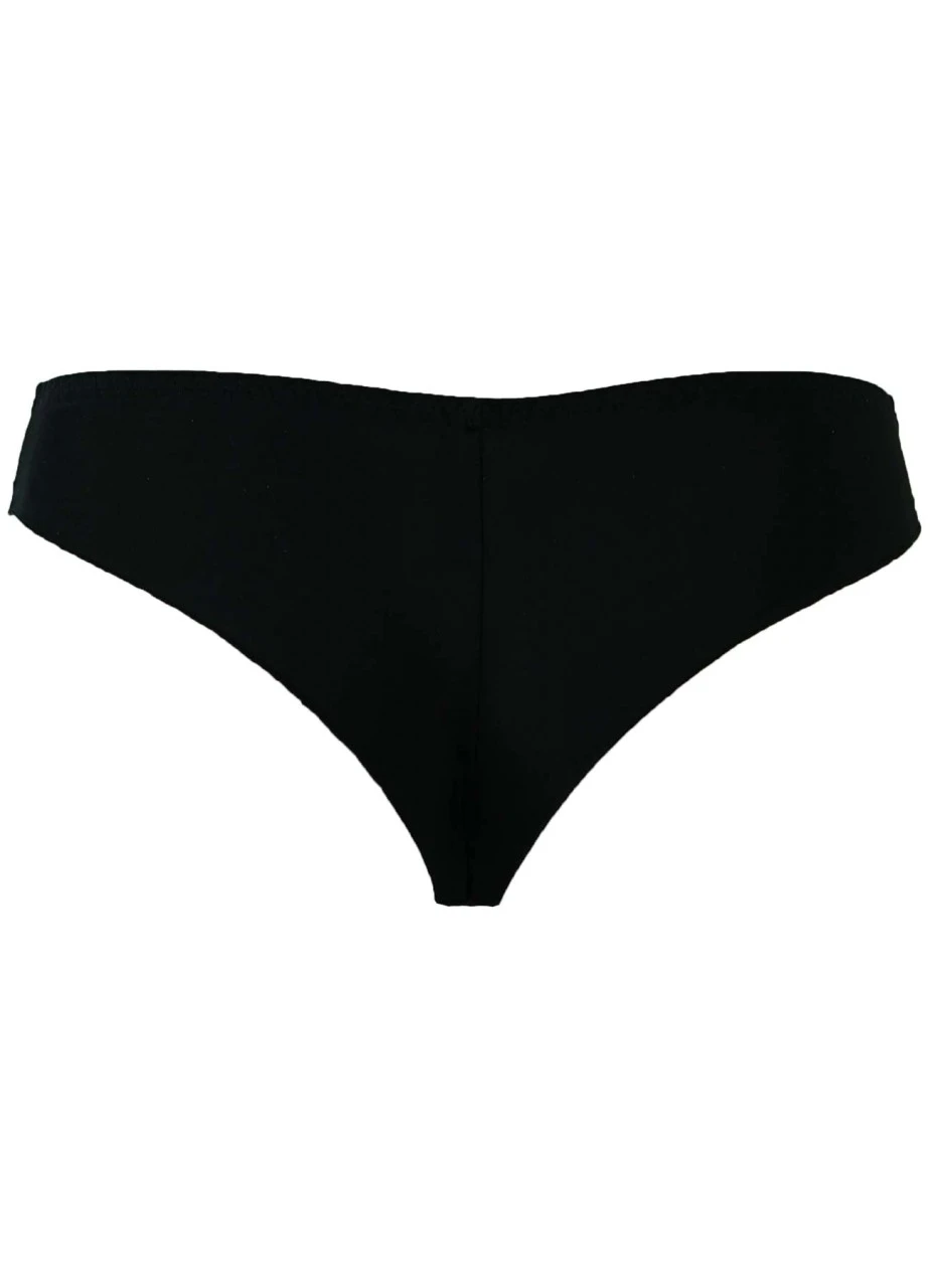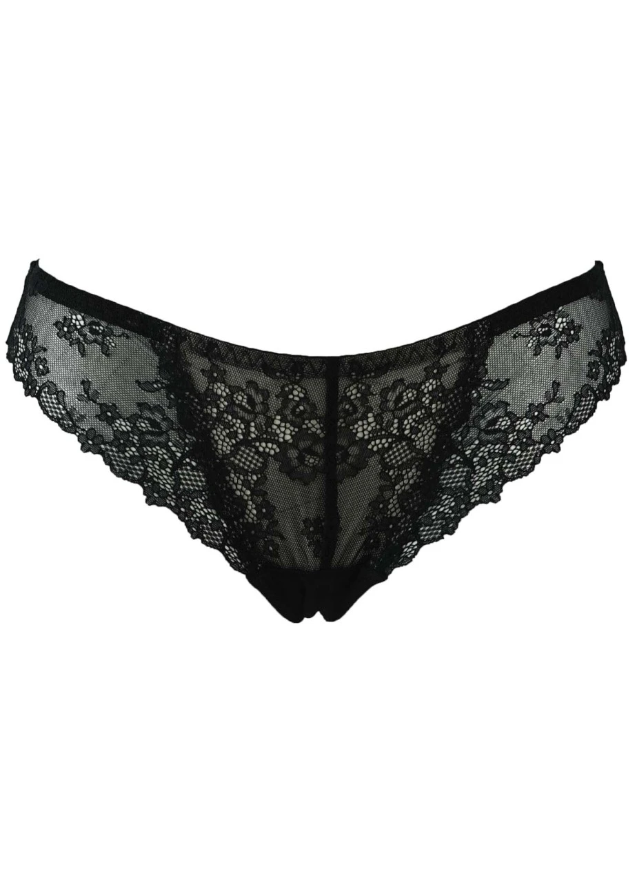 Wir lieben schwarze Spitze. Der Tanga “Belle” kombiniert transparente blumige Spitze am Beinausschnit mit unterlegter Spitze vorne. Hot!